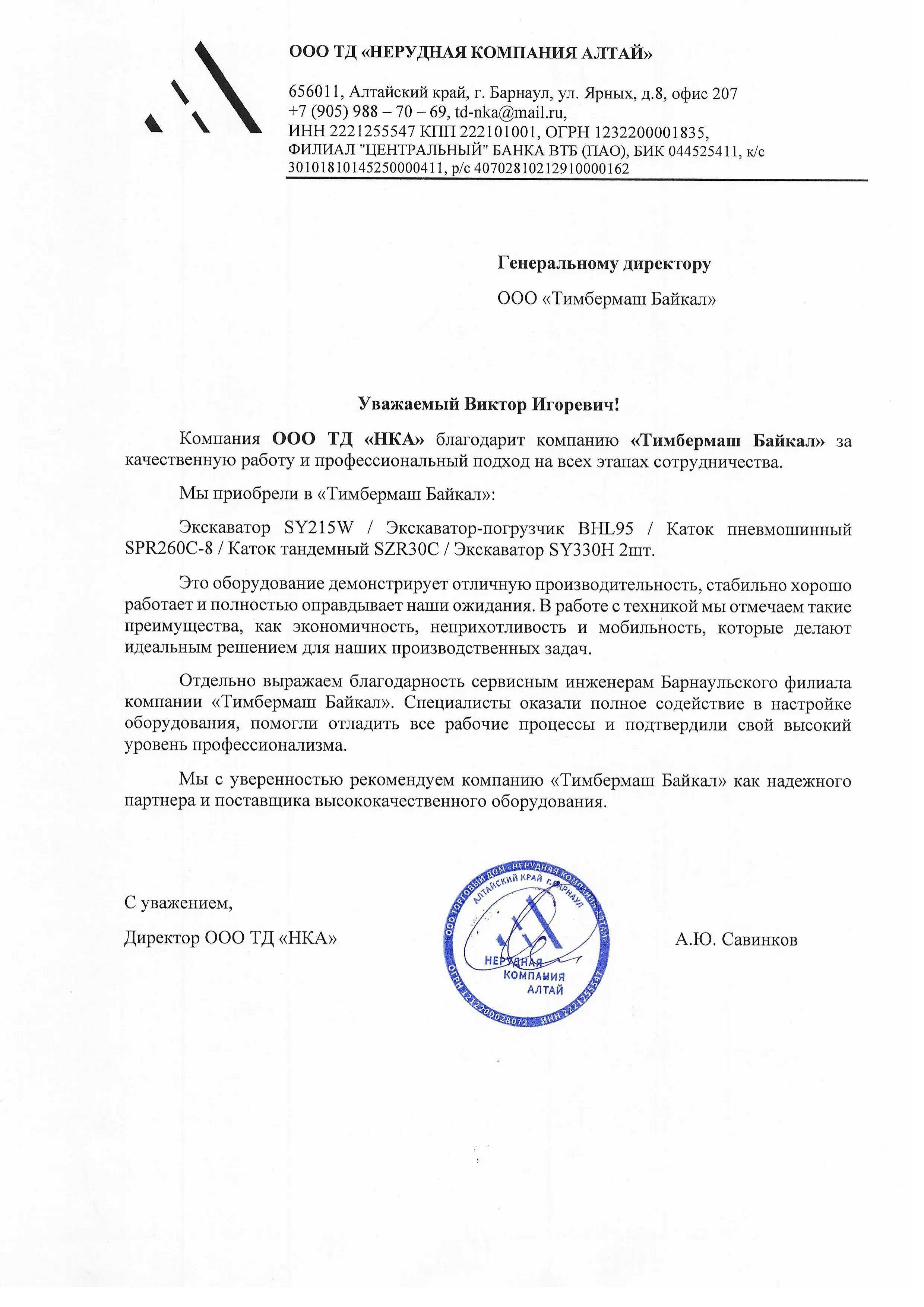 Рекомендательное письмо ООО "Нерудная компания Алтай"